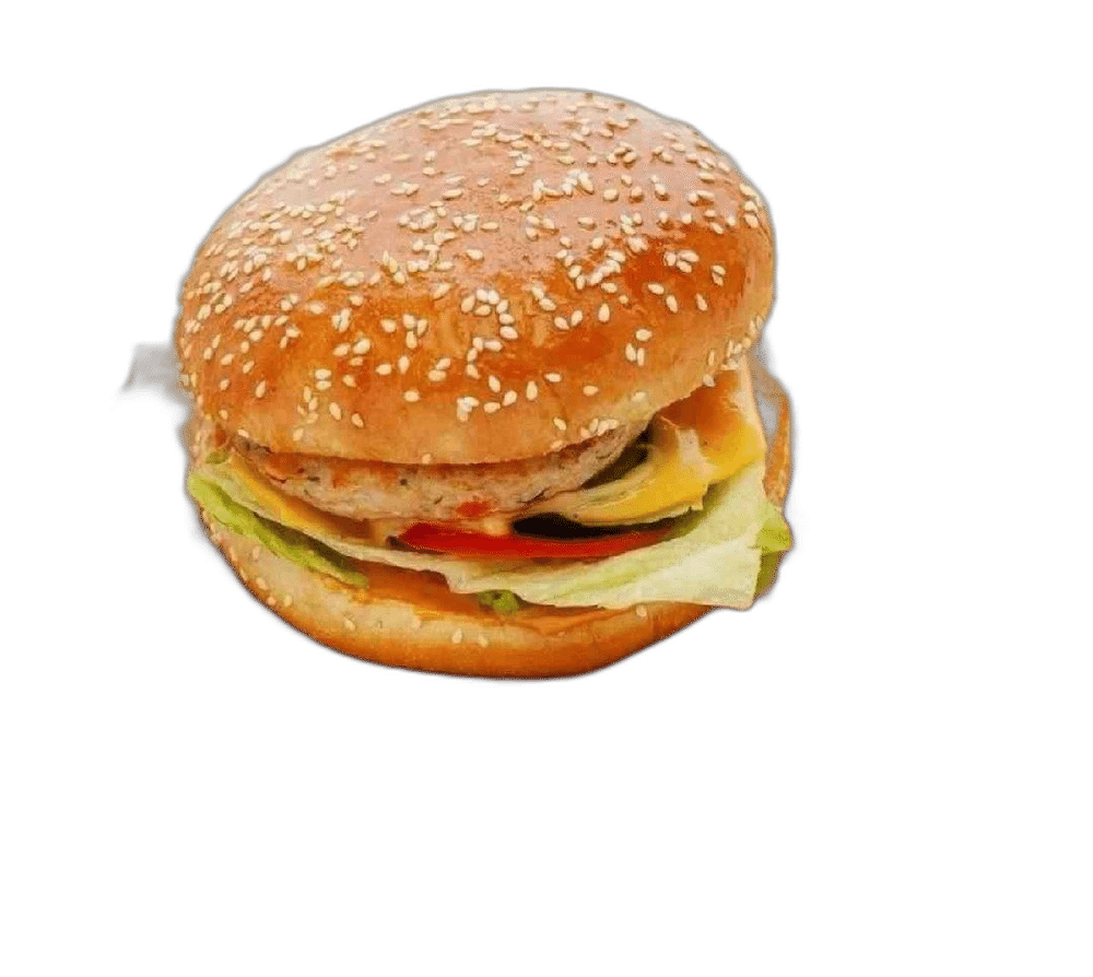 Булочка, фирменный соус, салат, котлета куриная, сыр чеддер, помидор, огурец