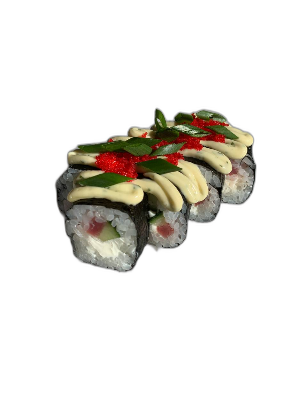 Творожный сыр, огурец, тунец, соус цезарь, икра масаго, лук зеленый